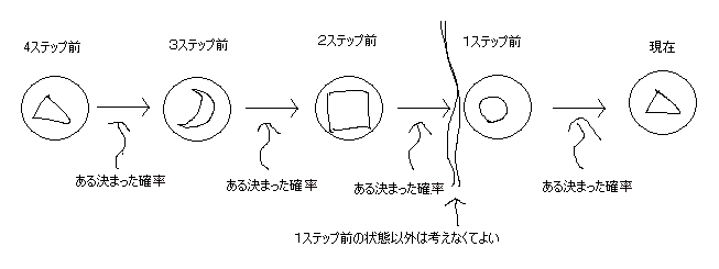 ○現在の状態から「1ステップ前」より前の状態は考えない。1ステップより前の状態によって確率が影響を受けることがない。